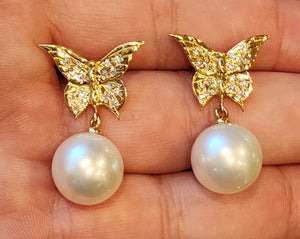 18K Gold Diamond Butterfly Earrings with South Sea White Pearls  - Regular price